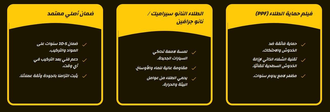 كما نوفر خدمات إضافية مثل أفلام الحماية الملوّنة، وصيانة أفلام الحماية، وحماية الزجاج الأمامي، بالإضافة إلى حماية الشاشات والأجهزة الداخلية.